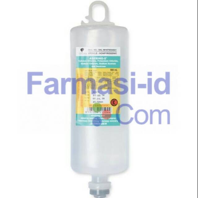 Botol plastik 500 ml infus. Otsuka Asering-5 merupakan cairan infus yang berisi larutan dextrose dan elektrolit yang dapat digunakan untuk memenuhi kebutuhan glukosa dalam tubuh ketika pasien tidak dapat meminum cairan yang cukup atau dibutuhkan tambahan dari luar demi menjaga keseimbangan cairan dan elektrolit. Setiap liter asering mengandung.