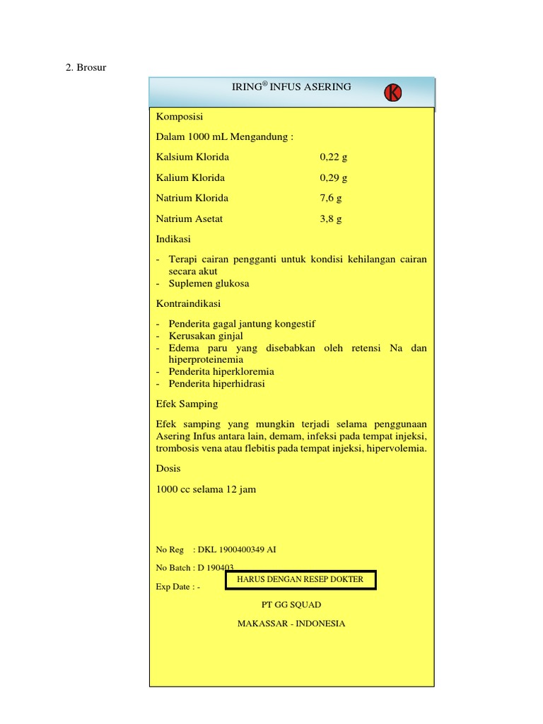 Na 130 mEq K 4 mEq Cl 109 mEq Ca 3 mEq Asetat garam 28 mEq Keunggulan. 250 mL 500 mL dan 1000 mL. SOP Pemasangan Infus sesuai akreditasi KARS - SNARS terbaru 2019 yang umum digunakan di berbagai fasilitas pelayanan kesehatan di Indonesia.