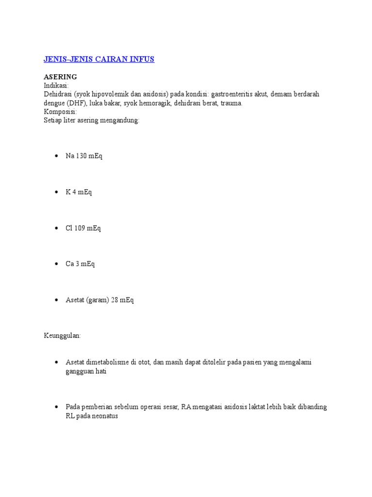 JENIS-JENIS CAIRAN INFUS ASERING Indikasi. Asering dengan kandungan indikasi atau fungsi dosis penggunaan efek samping kontraindikasi dan hal-hal yang harus diperhatikan dengan baik dan benar oleh penggunanya dengan tujuan untuk menambah cairan menambah produksi plasma darah memenuhi beberapa defisiasi mineral dalam tubuh secara aman dan sesuai. Jika satu selang infus digunakan bergantian selang sebelumnya harus dibersihkan dengan cairan lain.