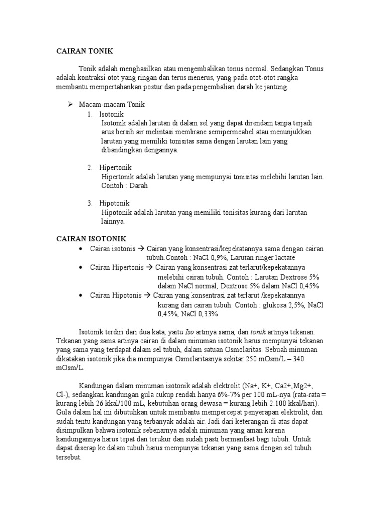 Contoh Larutan isotonik- Larutan isotonik adalah larutan yang memiliki osmolaritas yang sama atau konsentrasi zat terlarut dengan larutan lain. Cairan ini mengandung natrium dan clorida. Secara umum keadaan-keadaan yang dapat memerlukan pemberian cairan infus adalah.
